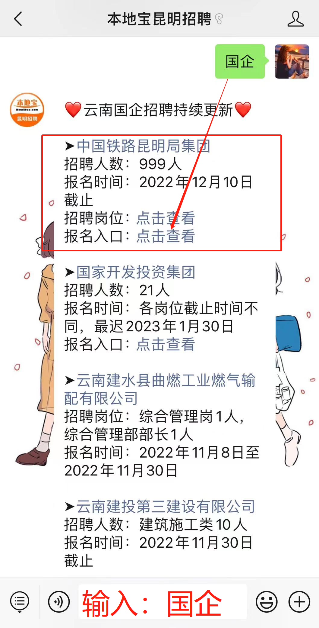 报名入口:点击下方名片,关注【本地宝昆明招聘】在首页聊天对话框中回复【国企】即可直接获得报名入口。