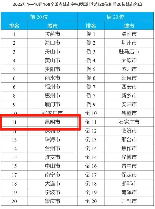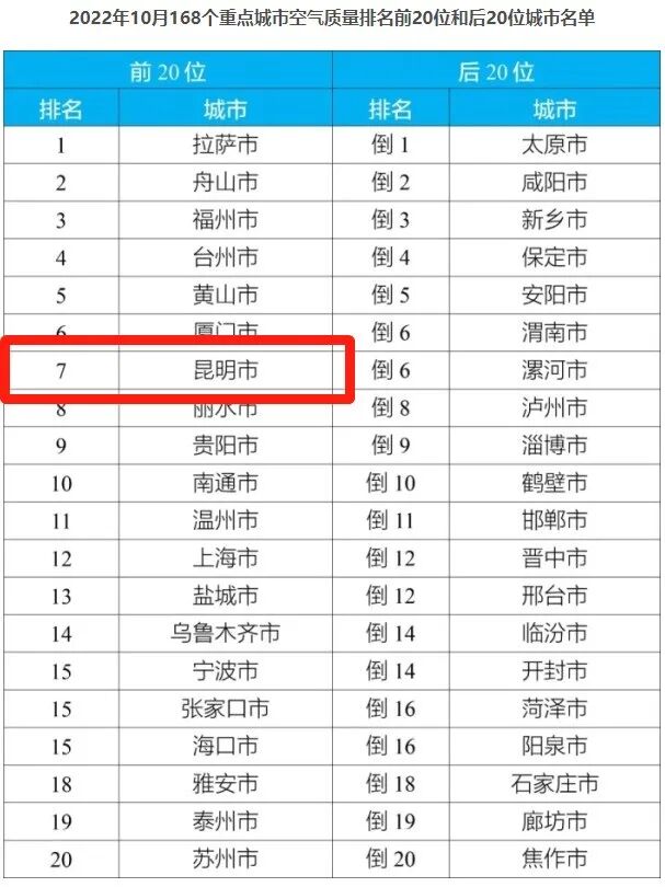 近日,生态环境部通报了今年1至10月,全国339个地级及以上城市平均空气质量情况,昆明的空气质量相对较好,在全国168个重点城市排名中,冲入了前20位。生态环境部还公布了,10月168个重点城市空气质量排名前20位和后20位城市名单。