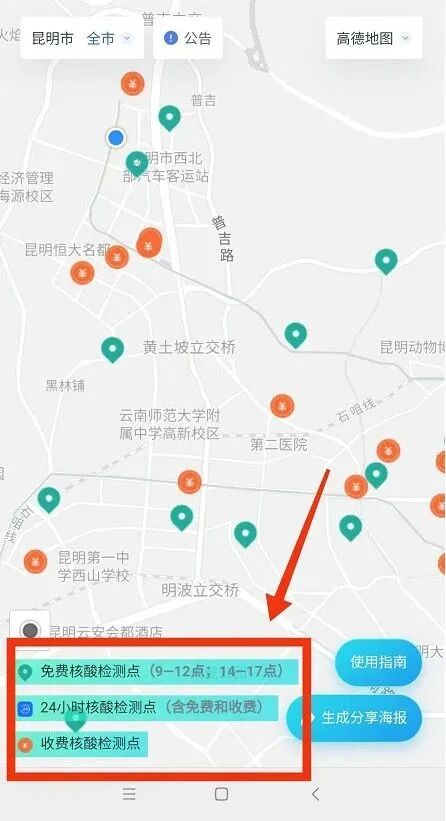 提醒广大在昆群众:在《昆明市免费核酸检测点地图》中可以查询以下三大类核酸检测点,群众可按需选择,在地图上找到离自己最近的核酸检测点。点进单个点位,可实现一键导航,一键拨号咨询。免费核酸检测点不提供纸质报告,仅在云南健康码中显示检测结果。如需纸质报告,请到医院或者单人单采的检测机构进行核酸检测。