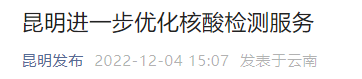 据昆明市应对新型冠状病毒感染肺炎疫情工作领导小组指挥部消息,昆明市严格按照党中央、国务院决策部署和省工作要求,不折不扣坚持国家第九版防控方案、落实“二十条”,在科学评估效果的基础上,进一步优化核酸检测服务。