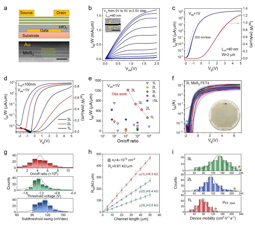 基于单层、双层及三层二硫化钼晶圆,他们加工了长沟道和短沟道的场效应晶体管器件,并表征了器件的性能。电学测量结果表明:100纳米沟长的晶体管在驱动电压Vds=1V时的开态电流密度从单层的0.4 mA·μm-1提高到双层的0.64 mA·μm-1和三层的0.81 mA·μm-1,分别提高了60%和102.5%;40纳米沟长的三层二硫化钼短沟道器件在Vds=2/1/0.65 V时的开态电流密度达到1.70/1.22/0.94 mA·μm-1的电流密度,为已报道的最高值,且具有超过107的开关比,优于国际器件与系统路线图(IRDS) 中高性能逻辑器件的2024年目标。