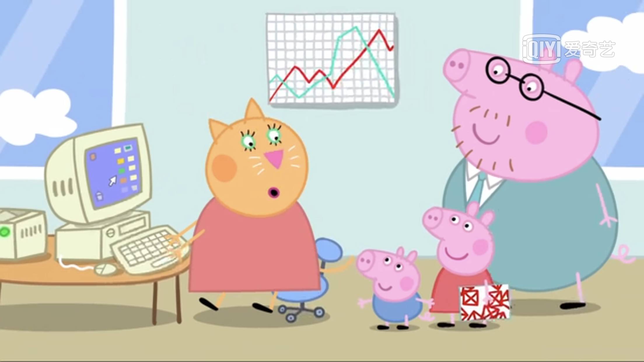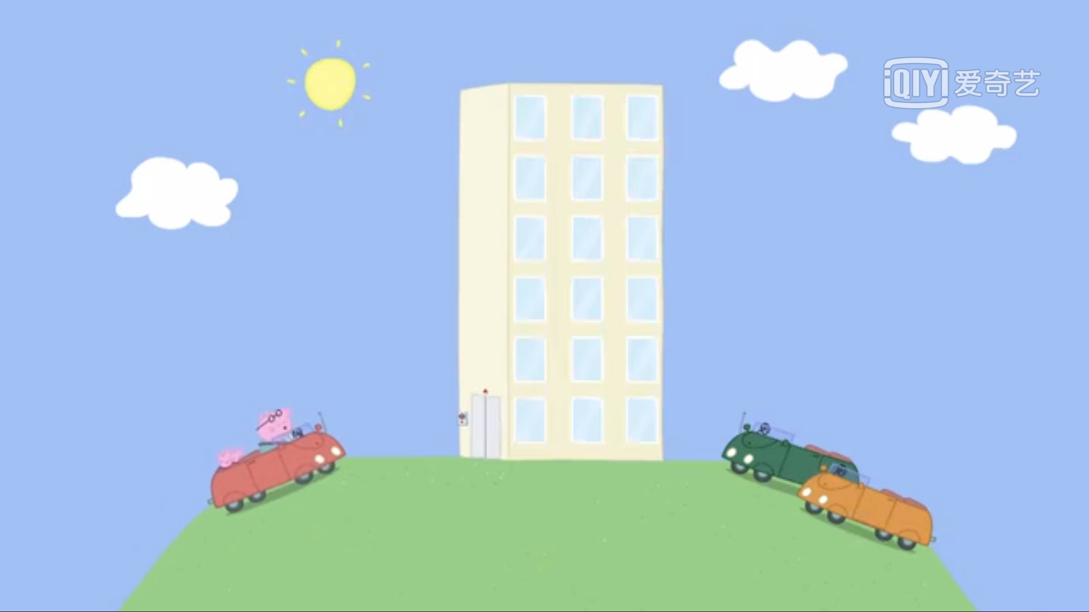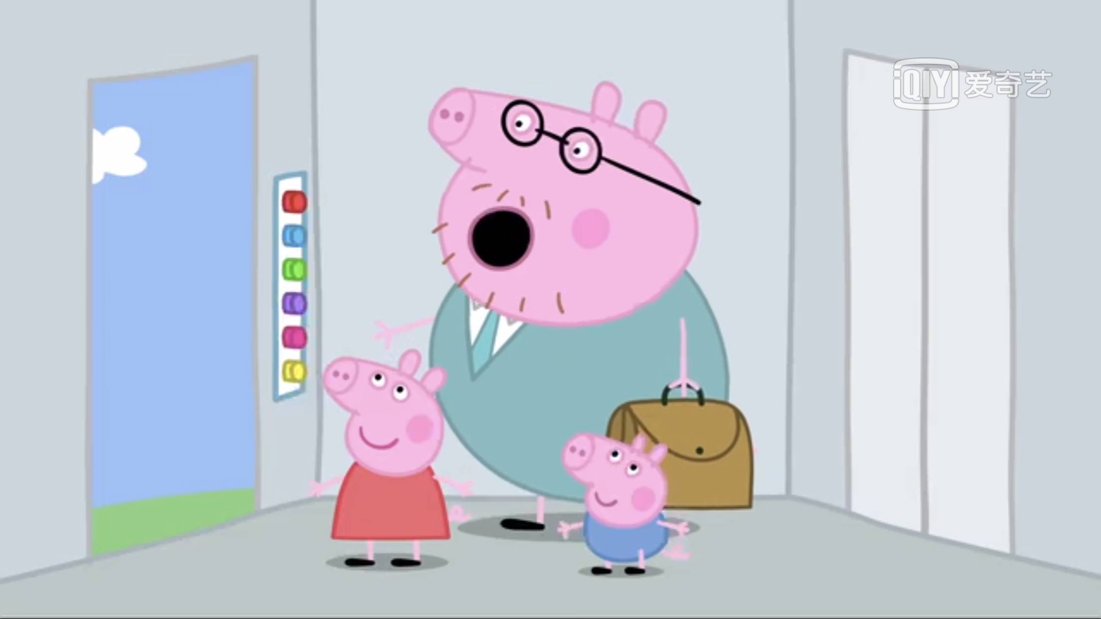 第一季67集,猪爸爸带佩琦和乔治参观自己的办公室,独栋写字楼,view看起来也很不错: