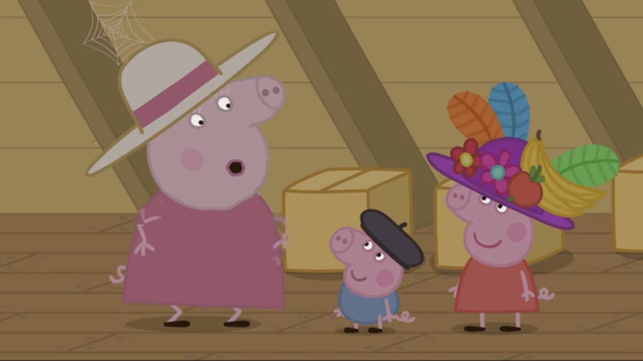 猪奶奶则是各类贵族礼帽的发烧友,在94集中听到猪爷爷要把它们扔掉而急得跳脚,赶紧给佩琦和乔治戴上。
