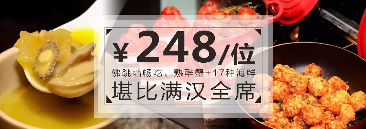 ¥248/位--首创“开运主题”概念自助,阵容堪比满汉全席!佛跳墙畅吃、创意“一牛六吃”、熟醉蟹+17种海鲜!吃一顿旺三年!