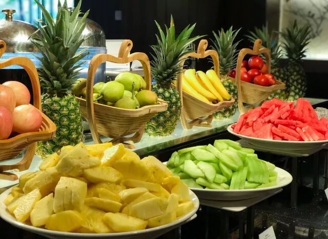 各种各样的精致甜品让人挑得目不暇接......一样来一份!每天还新鲜供应切片水果,也很解腻哦~