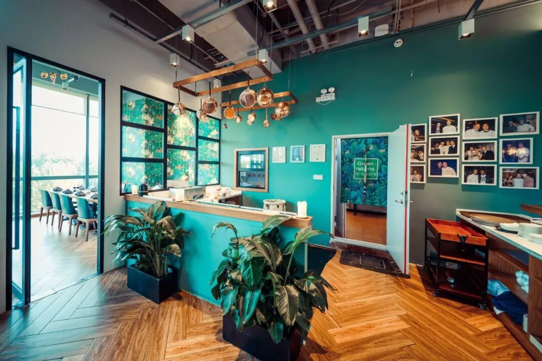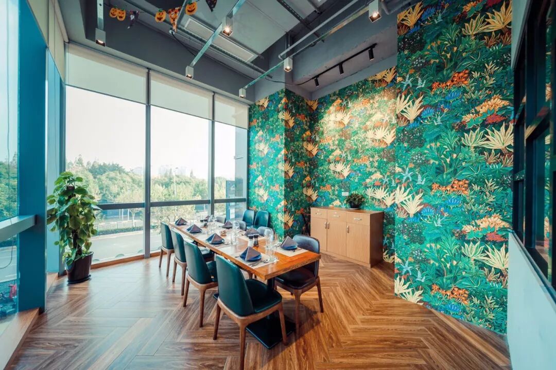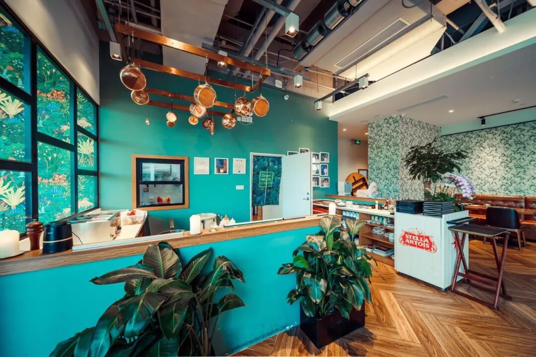 整座餐厅的色调是浪漫的蓝色。皮质桌椅和唯美的墙绘,低调内敛、简约且不失华丽 ,还有随处可见的鲜花绿植。