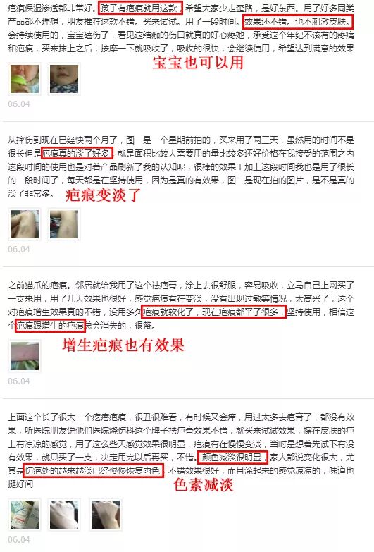 “疤痕淡化了“、”效果明显“、”温和不刺激“等关键词,刷屏式出现: