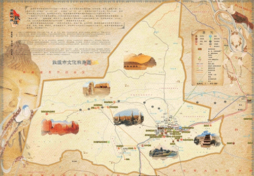 甘肃省旅游地图真丝丝巾,旨在全面展示丰富多样的甘肃旅游资源,185个甘肃代表性风景文化胜地一一标注,飞天佛塔、骆驼雄鹰、雪山草原、沙漠幽湖巧妙搭配,或闻琴声悠扬,或看仙鹤翱翔,整个设计给人一种古道丝绸路的韵味,这也是甘肃首次推出的一款地图丝巾。在敦煌市文化旅游图中,将最新敦煌市区地理信息数据和本地风俗人情、特产名吃融合在一张图中,整体采用古朴素雅风格,既蕴含文化意味又有显著的地理标识,特种复古仿牛皮纸材质,实用便携,极具收藏价值。在敦煌市城市影像图中,以更加立体和直观的形态反映敦煌实景和现时风貌,为文博会决策部门提供了极好的辅助图件。