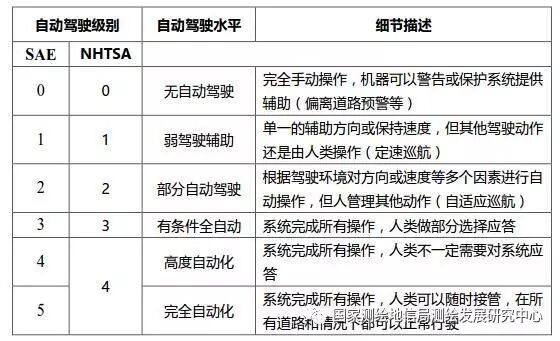 自动驾驶汽车技术的研发最早可追溯到上个世纪60年代 ,在本世纪初呈现出接近实用化的趋势。根据美国汽车工程师协会(SAE)和美国高速公路安全局(NHTSA)的分级标准,自动驾驶的分级如表1所示,其中SAE 3-5级(NHTSA 3-4级)才能称得上自动驾驶。目前,研发自动驾驶技术的主要有两股力量:一是以谷歌、百度等为代表的互联网巨头,二是传统汽车制造商,如宝马、通用等。据国内外媒体报道和业内认知情况,谷歌在全球自动驾驶领域处于绝对领先地位,绝大多数厂商仍处于SAE 2-3级的研发阶段。