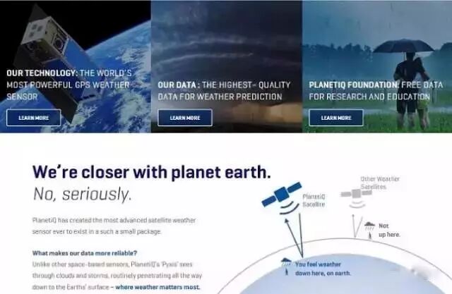 PlanetiQ 是一家基于卫星的气象数据服务公司,这家公司研发出了 Pyxis 传感器,安装在卫星上,可以追踪穿过地球大气层的 GPS 信号,对全球范围内的气温、气压和湿度进行测量。Spire致力于部署一个气象卫星网络,为政府和商业客户采集气象数据。Spire 计划向太空发射卫星来获得大气温度、压强和湿度曲线之类的气象数据。目前,Spire 已有超过 10 个客户,主要是政府和商业客户。前期主要销售数据,后期将有可能提供基于气象数据的增值服务。