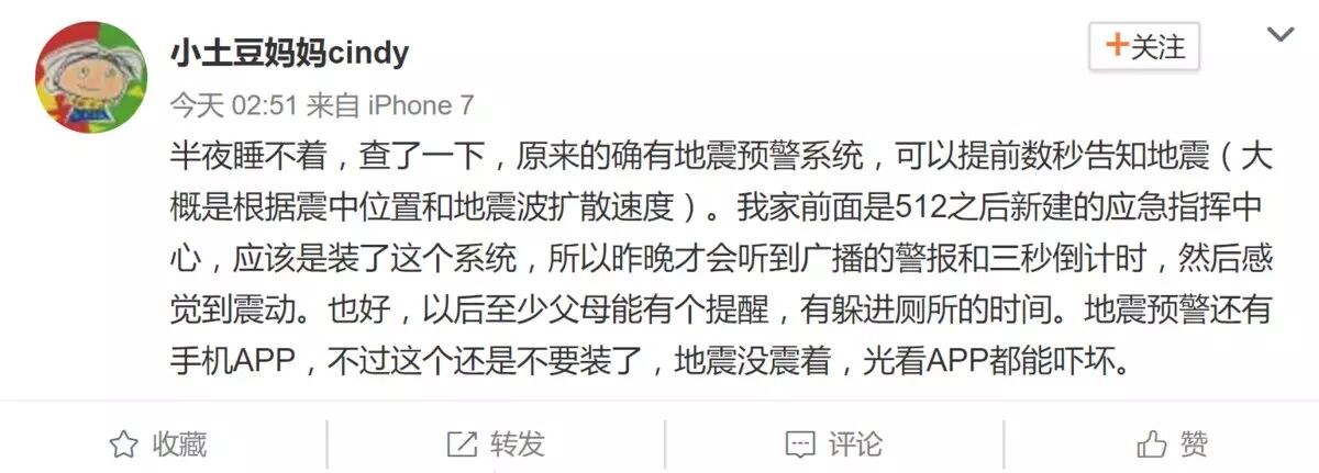 当然,如果你在第一时间看到这则信息并迅速躲到厕所的反应时间是相对充裕的,经测试为5~7秒左右。这也是为何微博有不少网友在感慨地震预警系统的重要性。