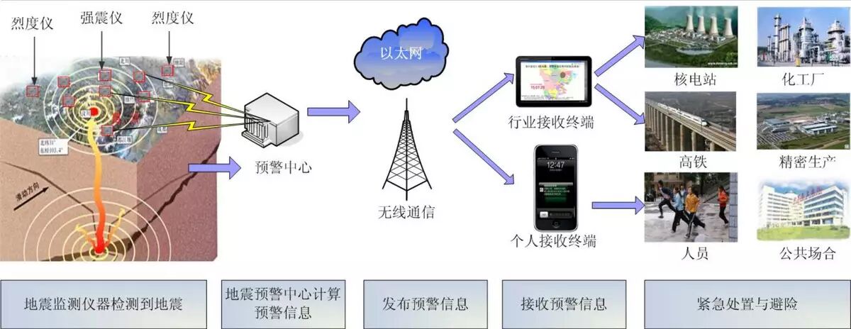 在地震发生时,它能够利用地震危险区域布设的高密度台网对震源进行监测,进而通过检测仪将检测到的关键信息发送至预警中心畸形分析处理,然后预警中心再通过各种信息接收终端发布预警信息给用户,最终用户接收信息并进行避险。