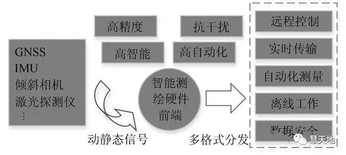 一般来说,智能测绘硬件前端可以直接连接各种智能传感器,保障实时的数据传输及远程控制,并在智能前端之间存在功能的交叉性。从数据采集的精密性来说,测绘前端可以采集多种动、静态的高精度信号。从智能化方面而言,测绘智能前端本身就包含了自动化测量、离线工作、自适应数据格式分发等多种能力。在可靠性方面,需要保证可测量信号的抗电磁干扰能力以及数据传输的安全性。对于如国防军工、资源勘探、公共服务等方面的关键性应用,云端虚拟设备必须通过政府相关法律法规的许可认证[13]。