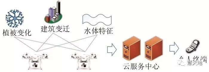 全站仪、水准仪、全球定位系统(Global Positioning System,GPS)等小型低功耗测绘装备在高精度的控制测量中有着广泛的应用。但小型低功耗泛化终端操作繁琐、专业性强,仍难以摆脱较为沉重的外业工作[8]。高速物联大数据采集装备一般包括视频影像监测终端、连续运行参考站(continuously operating reference stations,CORS)数据实时采集终端、自然资源信息在线监测系统等,如图 1所示的地形图自动更新系统。这种大数据采集装备在众包采集、违法用地和违法建筑的视频监测以及人流量在线采集等方面有着较为广泛的运用,有利于实现无人化、高效率、高灵敏度的实时监测。测绘地理信息在不断地扩展自身数据采集手段(无人机、无人船等)的同时,也将结合大数据与云平台为智能决策提供新的技术手段[9-10]。目前,云端智能运算中心的代表者为阿里云、千寻云端定位等。基于云平台的百度无人驾驶,智能定位导航算法让测绘地理信息走进了人们的生活,满足了人们的个性化位置服务需求。与智能决策相关的道路交通决策疏导、智慧城市运行的终端应用提高了人们的生活品质。基于位置的税收现场支持、智慧矿山决策支持则大大减少了企业市场的人力成本[11]。