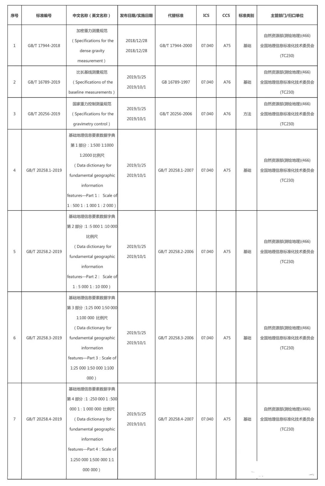 7项国家标准分别是GB/T 17944—2018《加密重力测量规范》、GB/T 16789—2019《比长基线测量规范》、GB/T 20256—2019《国家重力控制测量规范》、GB/T 20258.1—2019《基础地理信息要素数据字典第1部分:1:500 1:1000 1:2000比例尺》、GB/T 20258.2—2019《基础地理信息要素数据字典第2部分:1:5000 1:1万比例尺》、GB/T 20258.3—2019《基础地理信息要素数据字典第3部分:1:2.5万 1:5万 1:10万比例尺》、GB/T 20258.4—2019《基础地理信息要素数据字典第4部分:1:25万 1:50万 1:100万比例尺》,均为对原标准的首次修订。