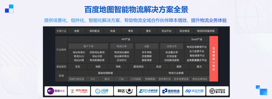 再比如在物流场景,百度地图在今年全新升级和发布了智能物流解决方案,从运前调度、运中管理、运后分析等各个环节,帮助物流全域合作伙伴降本增效。在运前调度环节,百度地图智能调度引擎以强大的算法能力为核心,以百度物流地图为载体,以云计算、大数据为基础,通过灵活配置约束条件、大规模计算的算法优势,为不同物流模式下的各种场景提供优质解决方案。在实际应用中,百度地图可先通过位置理解、地址标准化服务和国内首发的地址解析聚合服务,快速且批量完成取货送货操作。并且可以利用自研的AI算法在分钟级时间内运算出满足各项业务需求的最佳运输方案,并综合考虑车型、运输地、收货时间等约束条件,生成成本最优的运输调度方案。百度地图智能调度引擎还支持调度员进行手动调整,便于应对突发情况。据某客户数据显示,该引擎能有效降低15%的行驶里程、17%的运输成本,以及91%的调度时间,带来显而易见的“降本增效”成果。