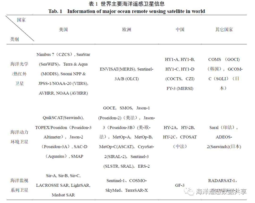国际上的海洋卫星大体分为三类:海洋水色卫星(如SeaWiFS)、海洋动力环境卫星(欧洲中心的Jason系列卫星)、海洋综合探测卫星(如Sentinel-3卫星)。