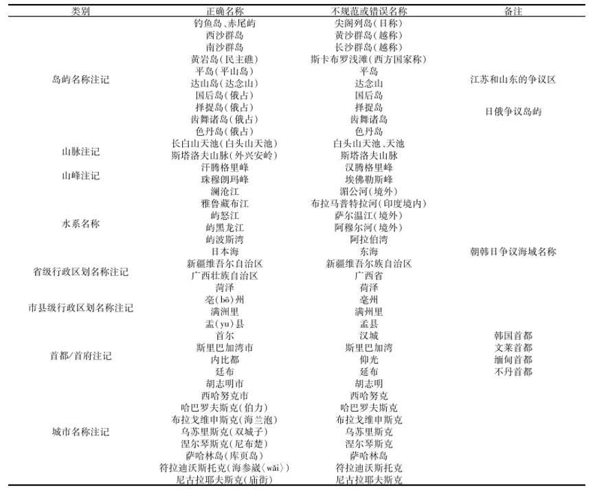 地图上的地理名称和注记是其正确展示地图地理信息的重要内容,对读者完整理解地物及其含义具有指示性和解释作用。《规定》在第三章第六条第(二)点规定,在国界线上要“正确表示中国国界线与地貌、地物、经纬线、色带等要素之间的关系,正确标注国界线附近的地理名称”,同时在第四章第十七条独立列出对有关地名注记的规定。