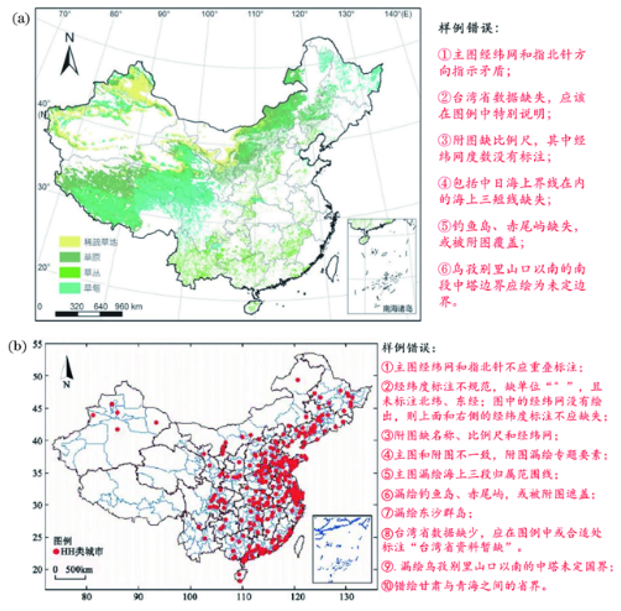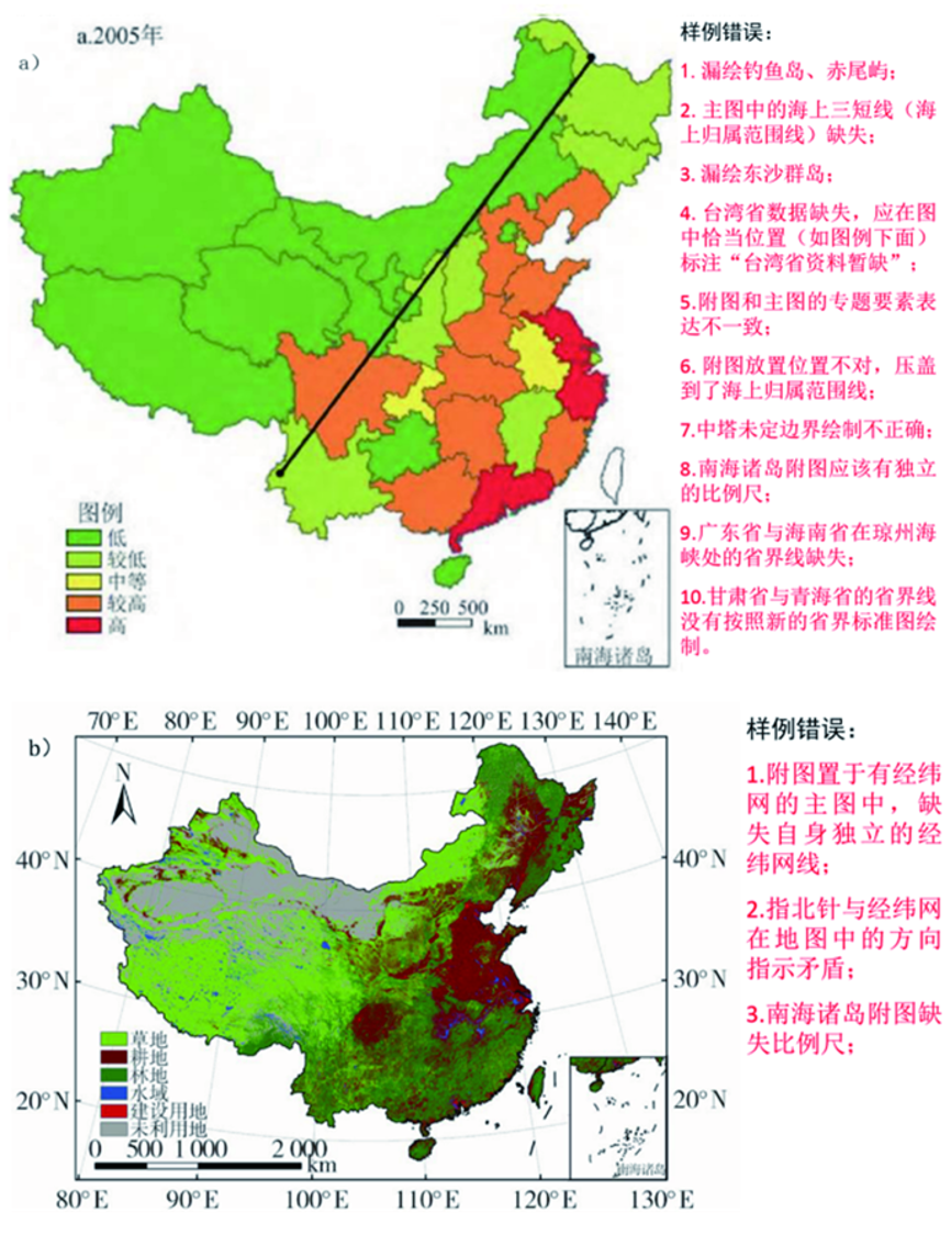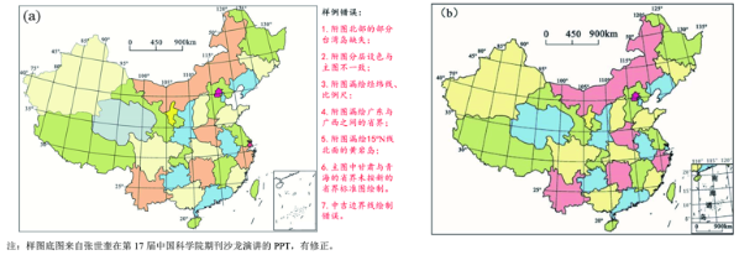 (2)如果将南海诸岛附图置于带经纬网的中国地图中,则附图一定要带有独立的经纬网和比例尺。图2(b)即为该类典型错误样例。