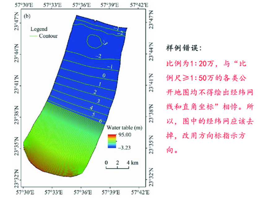 (4)地图中经纬度的表示不能用小数点,而应该用度、分、秒来表示,而且分和秒都用两位数来表达,如36.5°N属于不规范表达,应该表示为36°30'N。