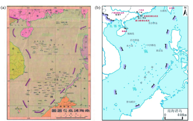 中华人民共和国成立初期,公开出版的中国地图基本上沿袭了1948年断续线表示的地图画法,但1953年按国家规定去掉了北部湾内的2段线,成为9段线。但该9段线与现今的9段线相比,虽然数量一样,位置却稍有修订。因此,王颖等认为,目前南海周围的界线在去掉北部湾界线后常被称为“9段线”似不恰当。而所谓的“3段线”,通常是指当南海诸岛以附图形式表示时,中国地图主图中的2段南海诸岛归属范围线加上中日海上归属范围线;10段线可以理解为南海诸岛的9段线[图26(b)]加上台湾岛东北面东海的中日海上归属范围线。