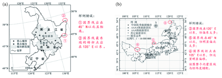 ⑦处的中蒙国界线折点应在95°E以东,错误样例图25(b)的错误非常严重,由于该图的整个内蒙古地图顺时针上翘了,因此该图的⑤⑥⑦处均出现错绘;