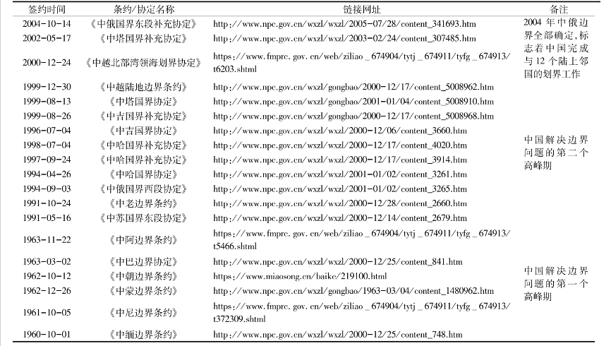 表1 中国与12个陆上邻国边界条约或协定的签署情况