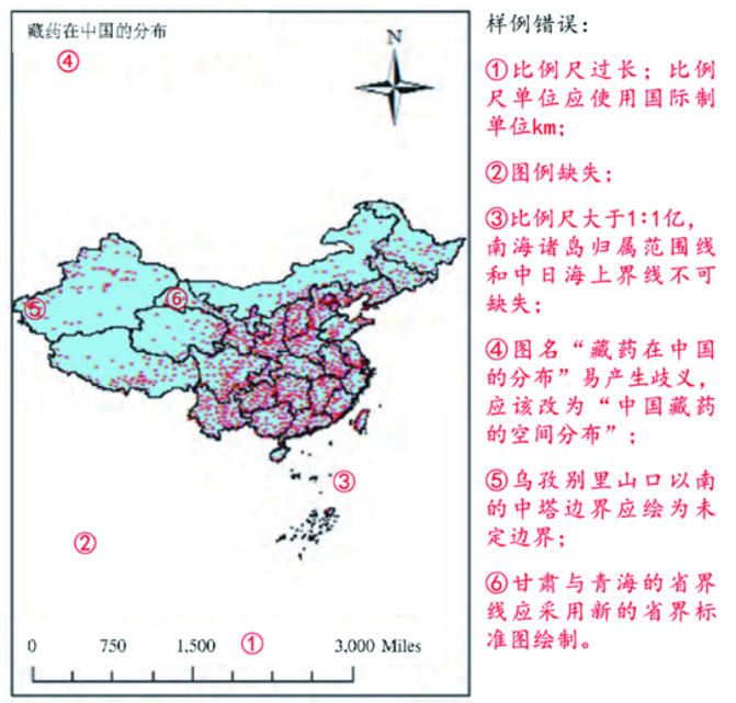 (5)遵从《地图管理条例》等相关的法律法规要求。图31作为典型错误样例的图例缺失,应该用图例标示图中专题要素红点的具体地理意义,哪怕只有一种专题要素。