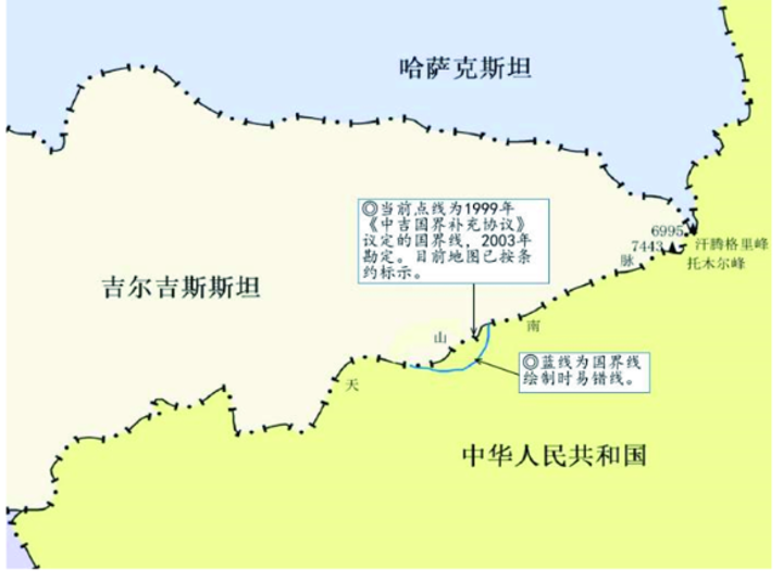 喷赤河南北流向河段的南段原位于中国与塔吉克斯坦边界争议区,虽然两国通过谈判在1997年和2002年签署了两份边界协定,但乌孜别里山口以南的南段中塔国界在国家标准地图上还尚未按协约进行标识,所以当前科技论文中涉及到中国全图地图的绘制时,其图幅范围仍须按照2003年颁布的《规定》要求绘制。