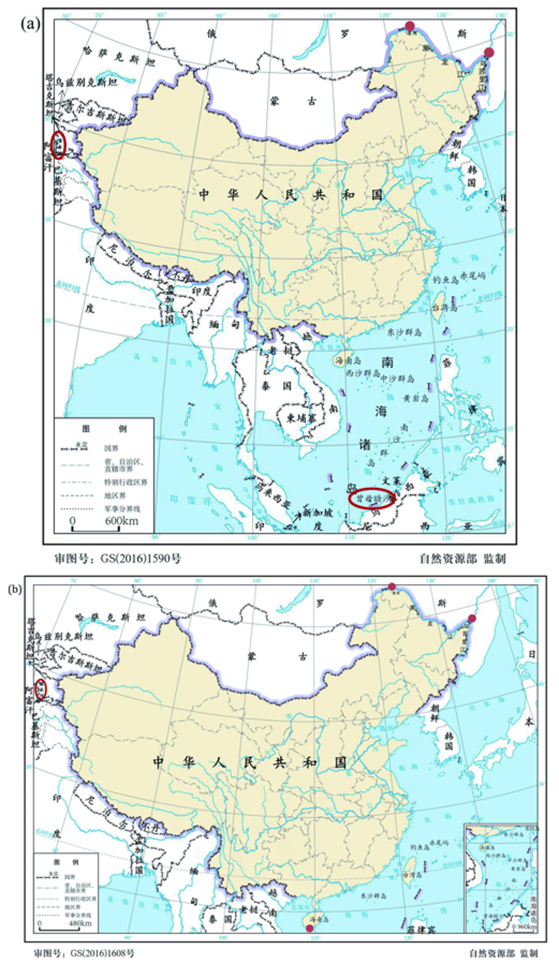 科技论文地图插图中,涉及行政区划界线问题最多的是国界线问题,其次是省界。因此,本节将重点分析国界线的不规范绘制或错误表达问题,省界仅述及错误较多的甘肃省与青海省省界等。