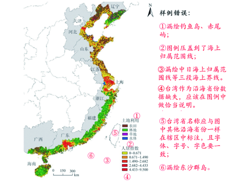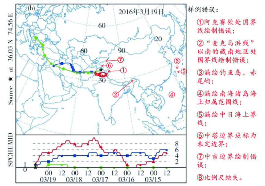(2)广东省与海南省在琼州海峡处的省界不能漏绘。图3(b)作为典型错误样例即错在“漏绘东沙群岛”“图例位置压盖到东沙群岛”两点上。