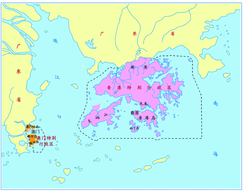(3)图面注记应注全称“香港特别行政区”“澳门特别行政区”;比例尺≤1:600万的地图上可简注“香港”“澳门”。