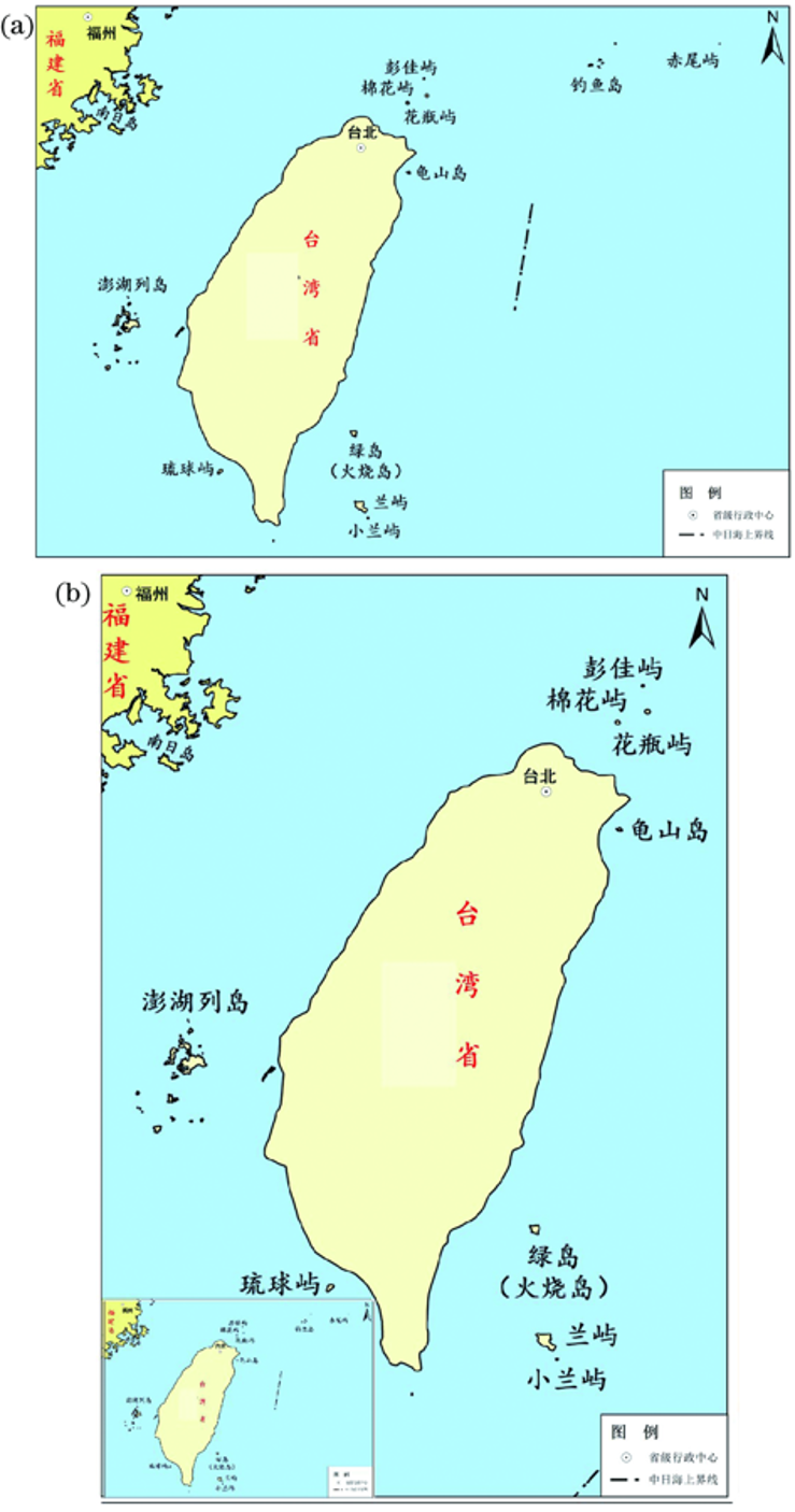 台湾省地图的图幅范围必须绘出钓鱼岛和赤尾屿(以“台湾岛”命名的地图除外)。钓鱼岛和赤尾屿既可以包括在台湾省全图中[图7(a)],也可以用附图的形式来表达[图7(b)]。