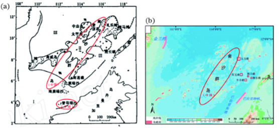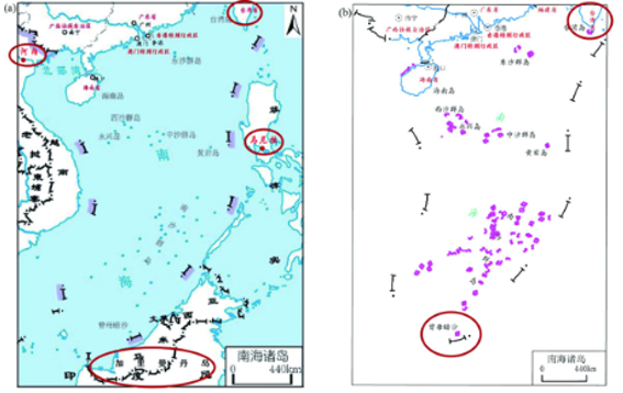 北面绘出中国大陆南端和部分台湾岛,东面绘出菲律宾首都马尼拉,西面绘出越南首都河内,南面绘出加里曼丹岛上印度尼西亚与马来西亚间的全部界线[图5(a)];对于不表示邻国间界线的南海诸岛图,南面绘出曾母暗沙和马来西亚的海岸线即可[图5(b)]。