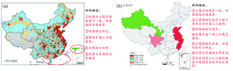(3)专题地图中如果部分地区数据缺失,要在图例中标识出来,常见错误包括台湾、香港、澳门数据缺失时未进行相应的说明[图2(a)、图29];