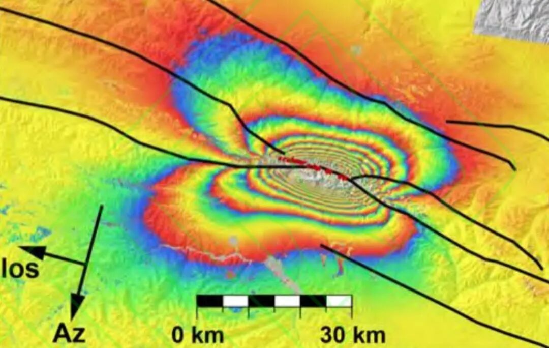DInSAR技术能够反映地表形变的空间分布特征。发生地震时,地震同震形变就会在差分结果中表现出来(图8),矿区开采过程中也会带来地表形变(图9),同样的,滑坡、泥石流、火山喷发等地表形变信息均会在DInSAR结果中有明显表现。DInSAR的这种能力,使得它在大范围形变监测以及形变信息普查中具有极大优势,可以为地质灾害早期监测、防灾减灾、地震监测等提供可靠的技术支撑。