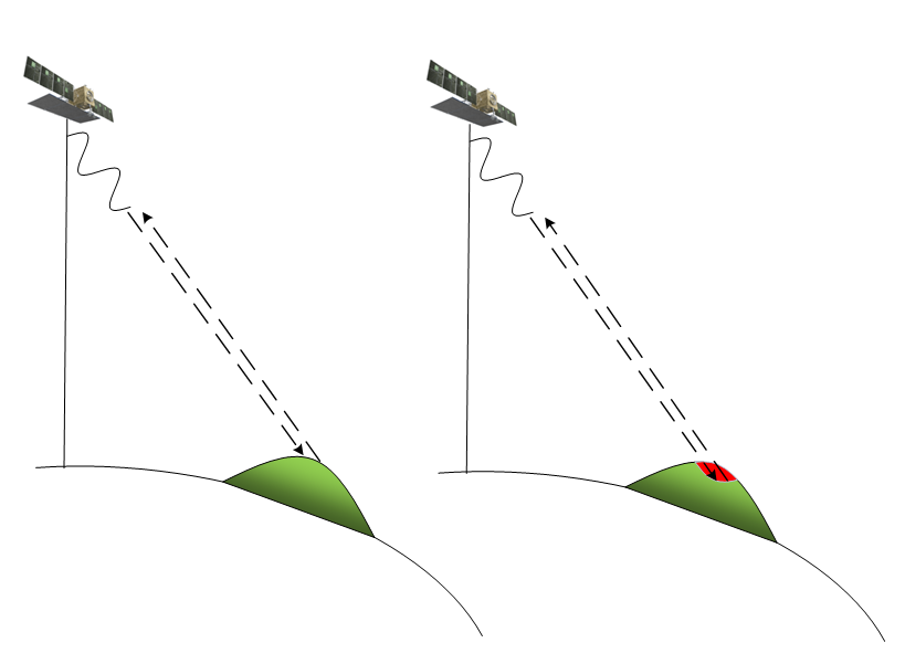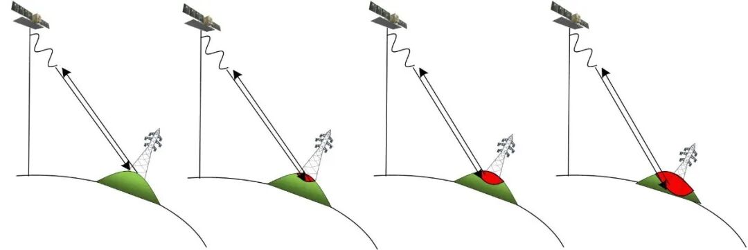 合成孔径雷达差分干涉测量(Differential InSAR,DInSAR)技术是InSAR技术的延伸,它通过2景SAR影像联合外部地形数据来获取地表的微小形变。差分干涉图是由两景不同时间获取的SAR影像组成,假如在这段时间内地表发生了形变,如图7,差分干涉图中将会记录相关的信息。DInSAR技术对形变极为敏感,对于陆地探测一号卫星来说,一个条纹变化接近12cm左右的形变变化。可见同为条纹,InSAR测地形的条纹,与DInSAR测形变的条纹,对地表信息的刻画程度有着数量级的差异。