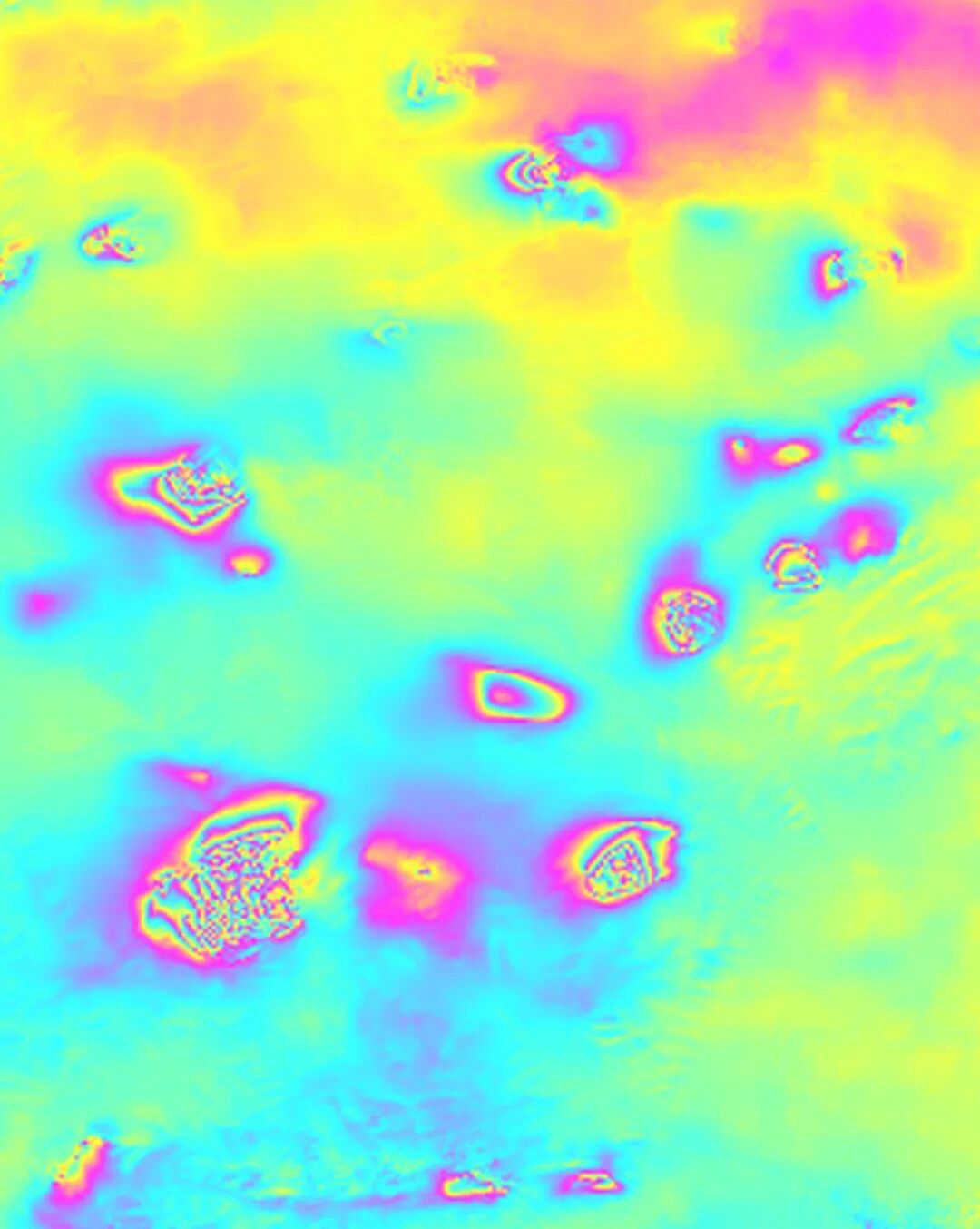 对比双缝干涉实验可以发现,InSAR与双缝干涉存在极大的相似之处。图3中的两条干涉缝等同于两颗SAR卫星,承影面即为卫星将要拍摄影像的目标区域,两颗卫星分别对同一目标区域发射具有周期性且频率相同的电磁波,经过干涉处理,就会得到包含目标区域地形信息的干涉条纹图(如图4)。通常,原始干涉条纹中的平地效应会掩盖地形信息,去除干涉条纹图中的平地效应便可获得仅包含地形信息的干涉条纹图(图5)。干涉条纹中包含了地形信息,此处一个条纹变化包含了接近50m左右的高程变化。