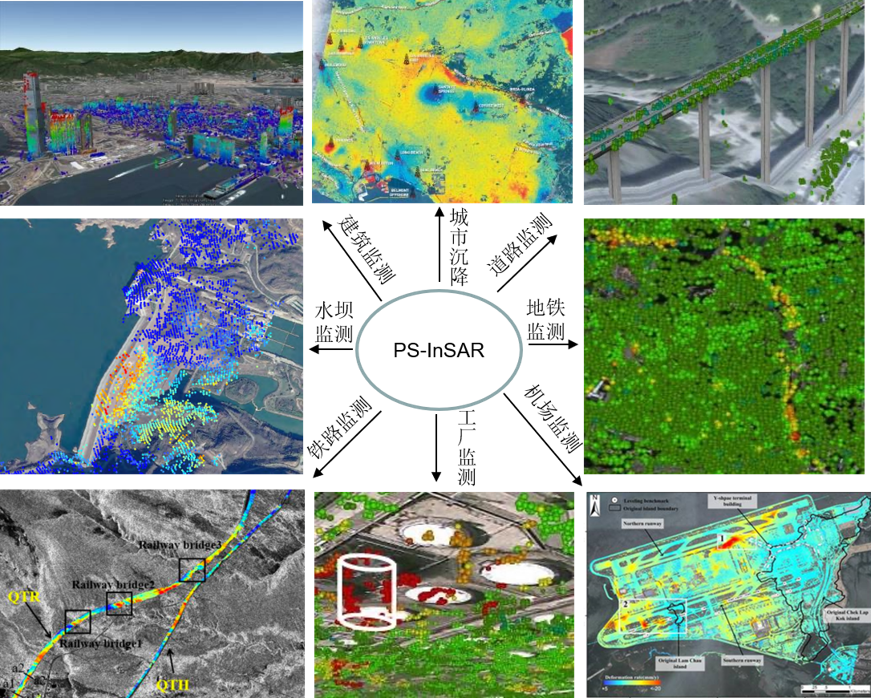 PSInSAR技术使用多景影像进行时间序列建模分析,具有监测精度高、抗相位误差干扰、能够揭示监测目标时序形变规律等特点,目前已经广泛应用于城市地面沉降以及建筑、桥梁、公路、铁路、地铁、工厂、机场等基础设施的形变监测(图12)。