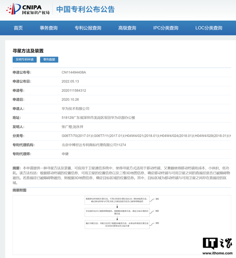 5 月 13 日消息,国家知识产权局信息显示,今日,华为技术有限公司公开了“寻星方法及装置”专利,公开号为 CN114494408A。