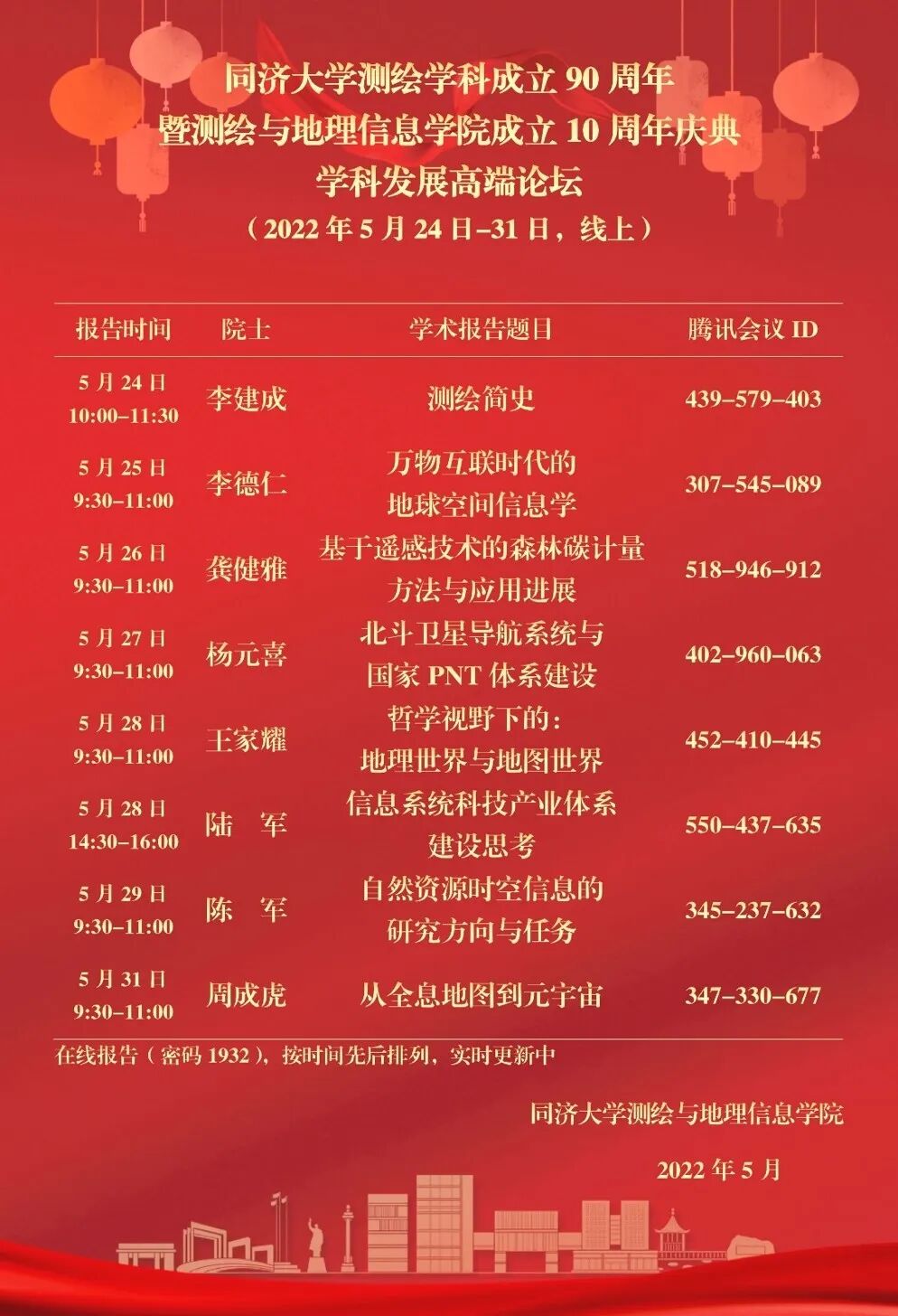 文章转载自微信公众号同济大学,来源:测绘与地理信息学院,版权归原作者及刊载媒体所有。5月24日上午10点,为庆祝同济大学测绘学科成立90周年暨测绘与地理信息学院成立10周年,同济测绘90周年学科发展高端论坛通过线上方式拉开帷幕,第一场报告由中国工程院院士、武汉大学副校长李建成教授主讲。值此,一场“云学术”盛宴正式开启。李建成院士为同济师生及测绘同行们带来了题为《测绘简史》的精彩报告,两千余人次线上聆听。作为庆祝同济大学测绘学科成立90周年暨测绘与地理信息学院成立10周年的重要活动,本次高端学术论坛邀请了李德仁、王家耀、杨元喜、龚健雅、李建成、周成虎、陆军、陈军等多名院士(持续增加中)于5月24日至5月31日分别作系列高端学术报告。来自海内外的测绘学科相关领域优秀校友代表、测绘与地理信息学院教师及广大测绘同仁等将齐聚云端,共商学科高质量发展,共话测绘美好愿景。![]()