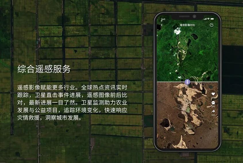 遥感影像赋能更多行业。全球热点资讯实时跟踪,卫星直击事件进展,遥感图像前后比,最新进展一目了然。卫星监测助力农业发展与公益项目,追踪监测环境变化,快速响应灾情救援,图像洞察城市发展。