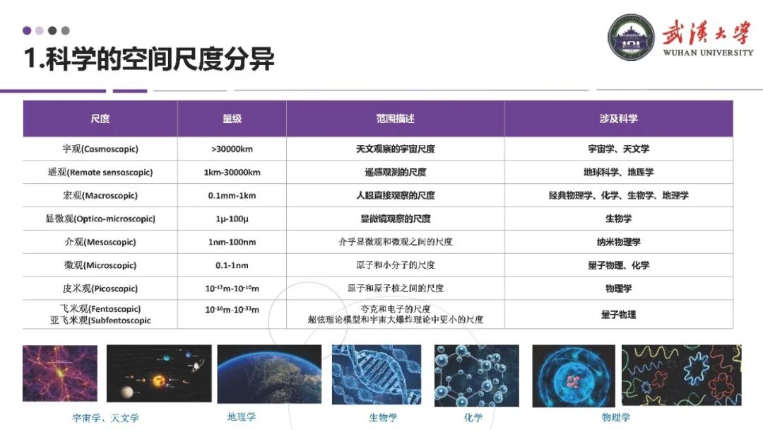 数、理、化、天、地、生等组成了常说的理学,也即英文的Science,它是怎么分类的呢?宇宙从最小的量子空间到原子和中子质子空间,然后到化学的分子空间、生物的细胞和DNA空间,到地球表面的地理学空间,再到星系天文空间,进而到整个宇宙空间,研究的空间尺度从十的负三十次方米到大于三万千米的尺度,都有学科与之对应,也即,在每一个空间尺度上,都有不同学科的科学家在研究对应尺度的现象。地理学研究的现象居于生物学和天文学之间的尺度,地球科学和地理学对应的是一公里到三万公里尺度。