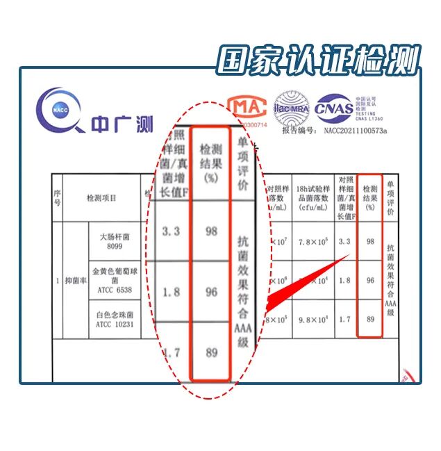 获得国家检测报告抗菌力98%,达3A级抑菌效果,水洗50次后功效不减。