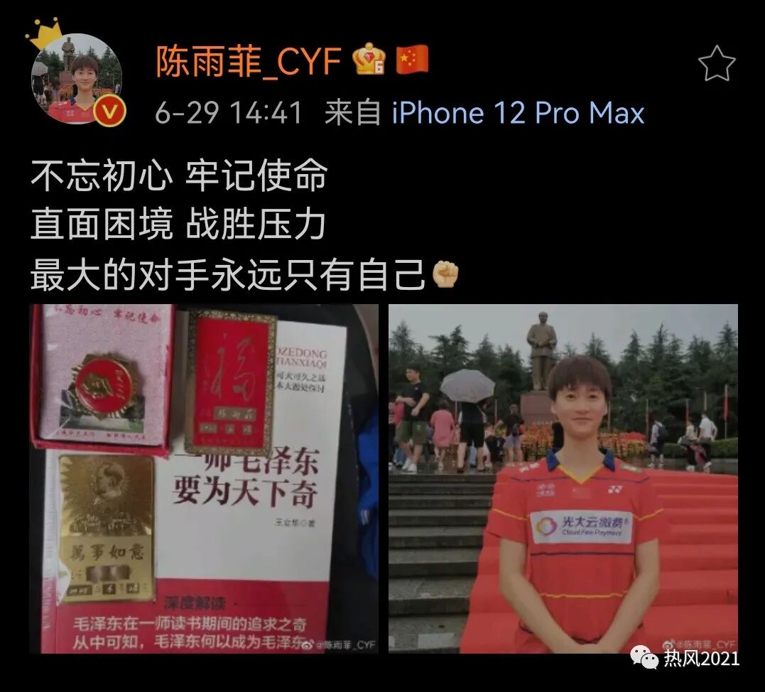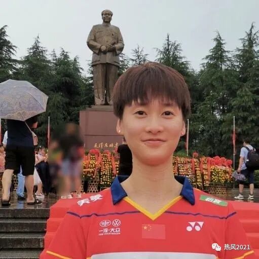 无独有偶,再前一天(8月1日)夺得羽毛球女子单打冠军的运动员陈雨菲,她的微博头像,就是跟韶山毛泽东广场毛主席铜像的合影: