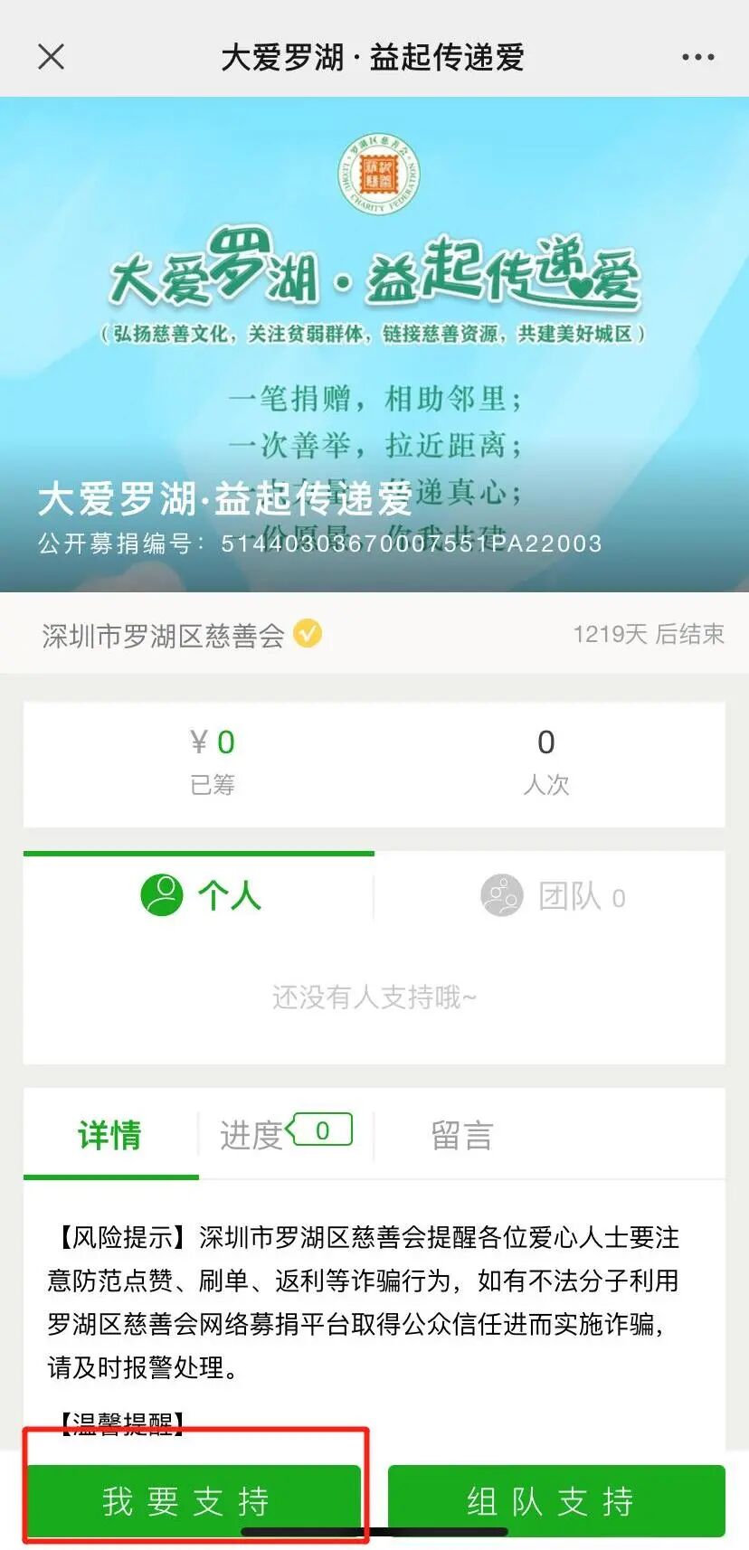 进入捐赠页面,点击”组队支持“,创建属于您的专属爱心团队,带头支持,同时可直接分享链接,邀请好友加入爱心团队,汇聚更爱心力量。
