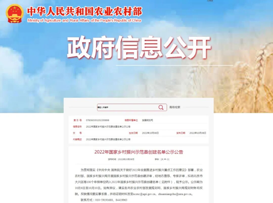 为贯彻落实《中共中央 国务院关于做好2022年全面推进乡村振兴重点工作的意见》部署,农业农村部、国家乡村振兴局开展国家乡村振兴示范县创建评审,经地方推荐、专家评审,拟将北京市大兴区等100个申报单位纳入2022年国家乡村振兴示范县创建名单(见附件),现予公示。公示期为10月8日至10月10日。如有异议,请实名向农业农村部发展规划司、国家乡村振兴局规划财务司反映。反映情况要实事求是,并将证明材料发至xczxc@agri.gov.cn、zhuanxiangchu@nrra.gov.cn。