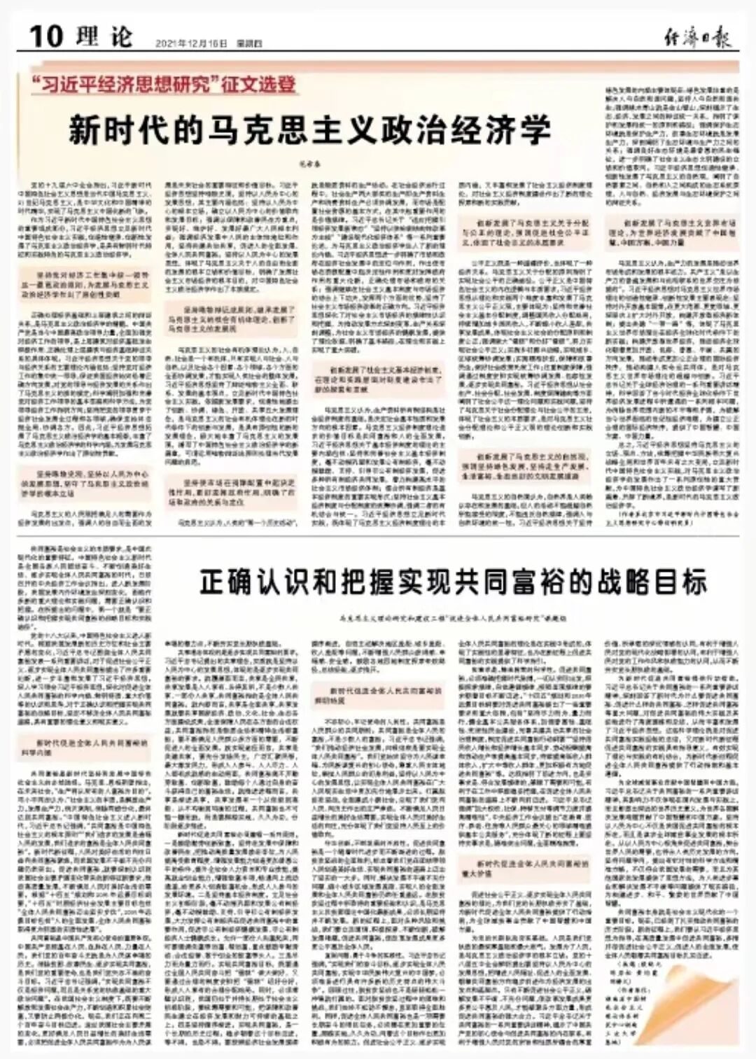 经济日报论苑今日继续推出“习近平经济思想研究”征文选登专栏,刊发北京市习近平新时代中国特色社会主义思想研究中心特约研究员范希春的文章《新时代的马克思主义政治经济学》,以飨读者。