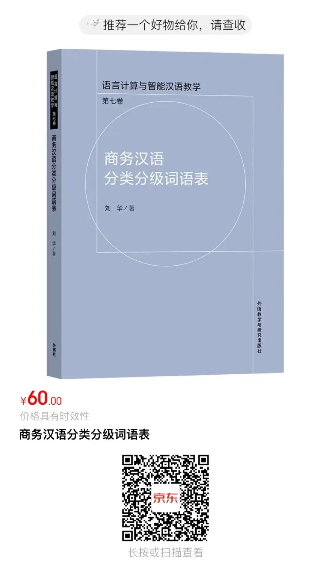 3. 截止日期:2022年8月19日(星期五)12:00,留言点赞数排名✨ 前3名✨为本次活动的幸运读者,将为其包邮(限国内)赠出《商务汉语分类分级常用词常用句研究》(纸质版);
