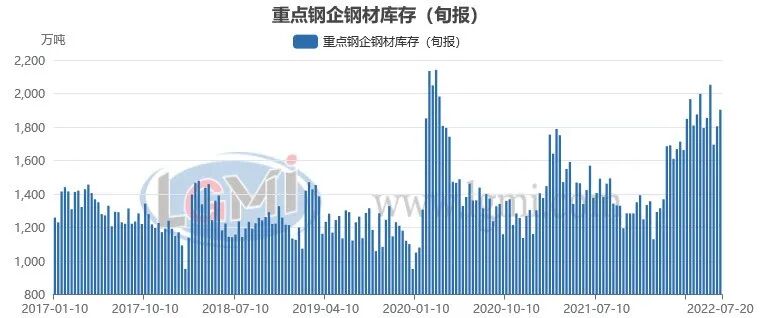 由于今年以来下游需求恢复不及预期,国内钢铁企业的钢材库存也明显高于往年,钢企去库压力倍增,据中国钢铁工业协会统计数据显示,2022年7月中旬重点钢铁企业钢材库存量为1903.13万吨,比上月底增加208.27万吨,上升12.29%;比年初增加773.44万吨,上升68.49%;比去年同期增加411.35万吨,上升27.57%(详见图3)。